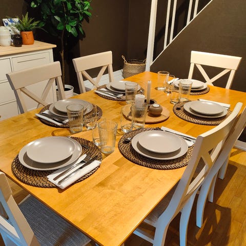Spisebord i heltre eik med seks stoler