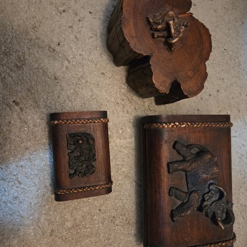 Et vakkert lite smykkeskrin i polert hardwood med innfelt figur i bein. (Elefant og palme). Innvendig kledd i grønn filt. Skrinet har en lengde på 15,5 cm / bredde 11 cm / høyde 6 cm.