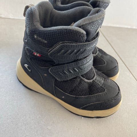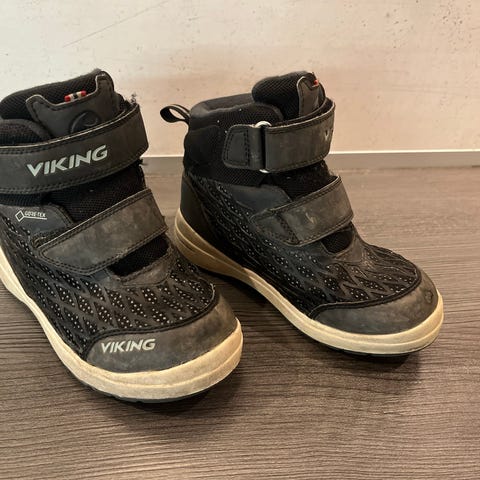 Viking GTX vinterstøvler i størrelse 27. Støvlene er unisex og har en svart farge. De er laget med slitesterkt materiale og har en såle som gir godt grep. Egnet for bruk i vintervær.