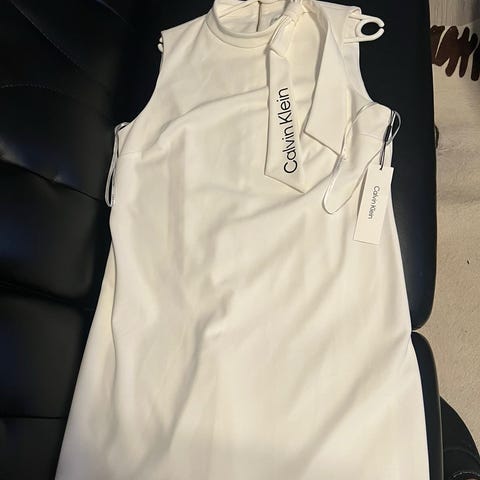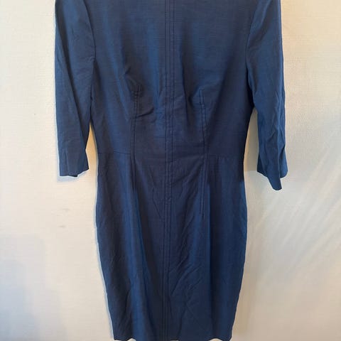 Stilren maxikjole fra Calvin Klein i en klar blåfarge. Kjolen har et minimalistisk snitt. Store ermeåpninger. Derfor følger det med en mini-tubetopp for å ha på over bysten. Rett snitt. Fungerer godt til selskap, sommerfest e.l.