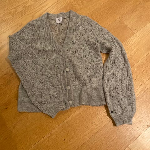 Urban Pioneers cardigan i blå ull. Strikket i mykt ullmateriale med korte ermer og knappelukking foran. Passer for dame i størrelse S.