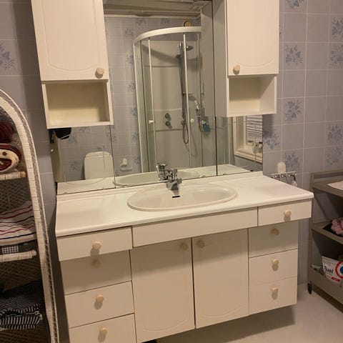 Baderomsmøbler med speil, blandebatteri, lysarmatur og overskap gis bort mot henting snarest. Ser helt og fint ut, men noe bruksmerker må regnes med. Alt følger med mot demontering og henting.