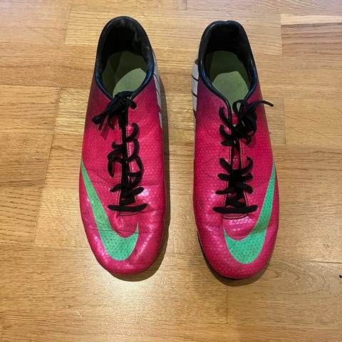 Nike fotballsko i fargene hvit, oransje/rød og svart. Skostørrelse er 40,5 EUR
