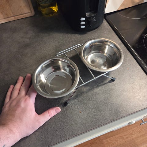 Kattformet mat- og vannskål laget i blå plast. Skålene er designet for kjæledyr og inkluderer en vannflaskeholder som gjør det mulig å fylle vann automatisk. Produktet består av to skåler formet som katter og en base med plass til vannflasker.