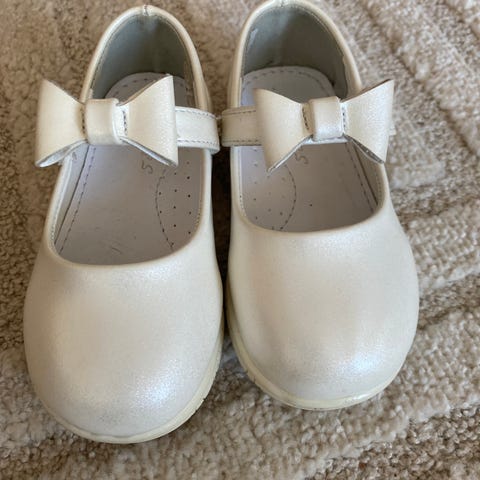De hvite skoene er fra Skofus og har innersåle i skinn. Litt glans i fargen slik at de minner om perlemor. blomster på reimen og passer i f.eks. bryllup. Reimen festes med borrelås.
