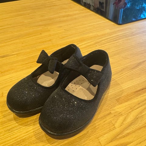 De svarte skoene er fra Stas er laget av tekstil som minner om semsket skinn. Liten sløyfe på reimen. Reimen festes med borrelås. Fin fasong med rund tupp.
