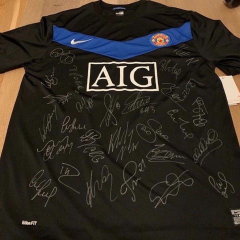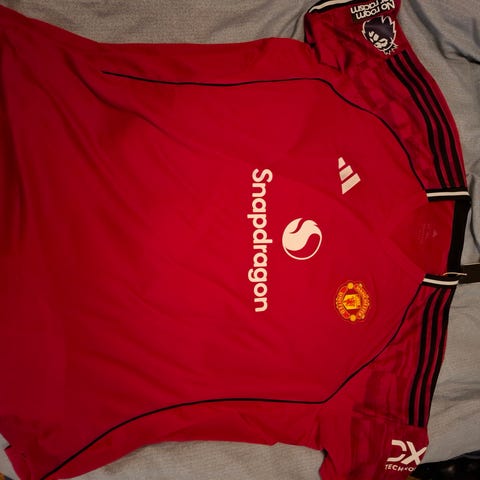 Man utd Fotballtrøye bortedrakt 2025/26i hvit farge, størrelse S med slim fit passform. ble produsert i Thailand. Designet med Man utd logo og sponsorlogoer, egnet for sportsbruk og som supportertrøye. Selges fordi den er for liten