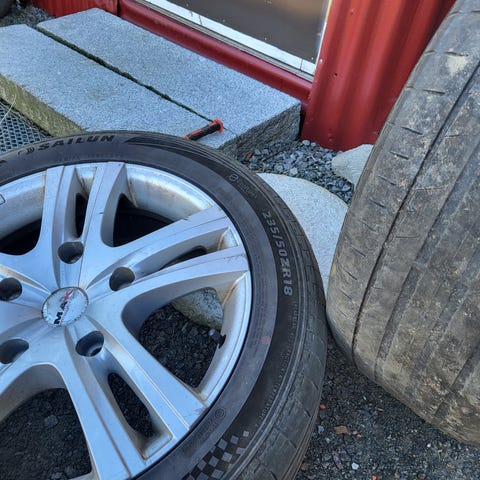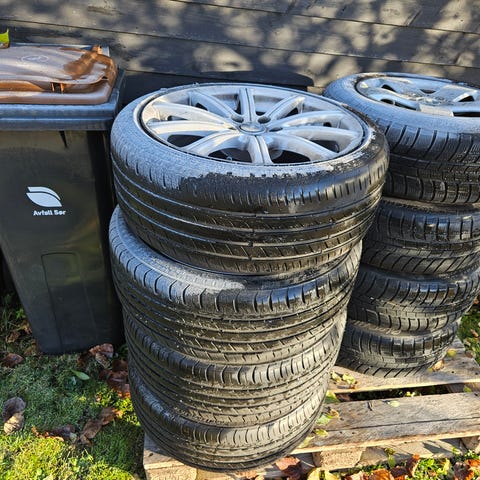 Selger også 4 felger med utslitte sommerdekk, disse også har 5x100, i tillegg til 4x100 og 4x114,3 Et av disse dekka har gummien løsnet på, mens resten heller ikke er egnet på vei da de er utslitt. En av disse felgene har noe grønnskjær etter lakkering i nærheten, burde gå an å få vasket vekk. Setter prisen på 2k.