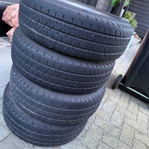 Piggfrie vinterdekk på stålfelg til Ford Transit Connect selges. Dekk produsert uke 23 i 2021, lagret tørt og uten sol. 5-6mm mønsterdybde rundt om, jevnt slitt. Tenkte 4k for disse.