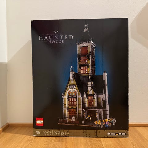 LEGO Icons Haunted House byggesett. Inneholder detaljerte komponenter for å bygge et skrekkhus med flere etasjer og tilhørende minifigurer. Passer for samlere og byggeentusiaster.