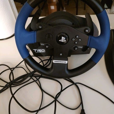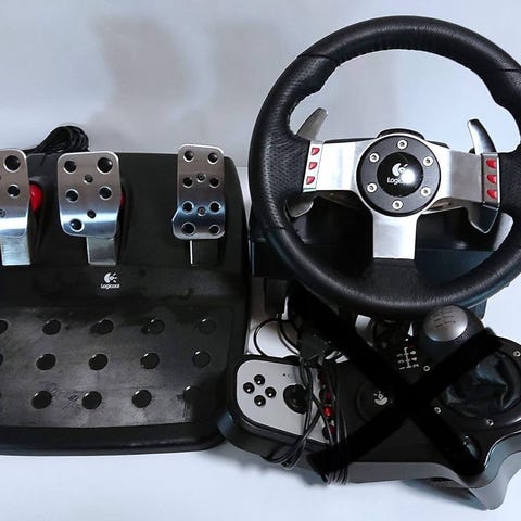 Settet inkluderer ratt med flere kontrollknapper og pedaler for gass, brems og clutch samt girspak til giring, kjøpt som ekstrautstyr.