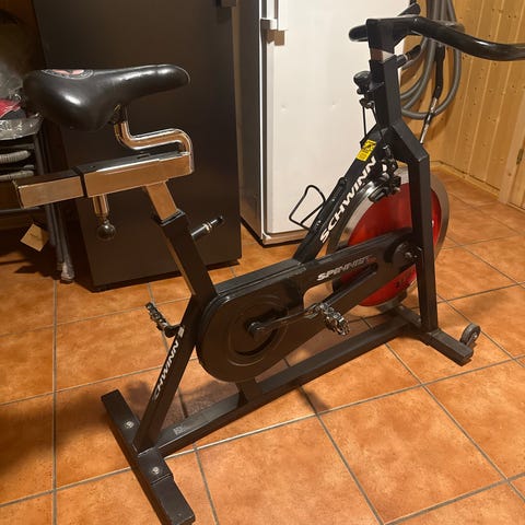 Spinningsykkel treningssykkel i svart farge. Egnet for innendørs trening med justerbart sete og styre for tilpasset komfort.