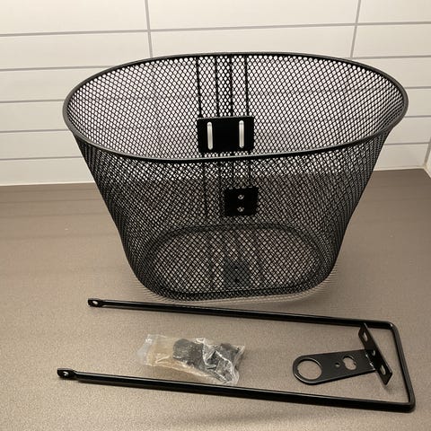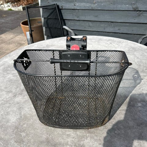 Sykkelkurv laget i svart metallnetting. Passer til montering foran på sykkel for oppbevaring av små til mellomstore gjenstander under sykling.