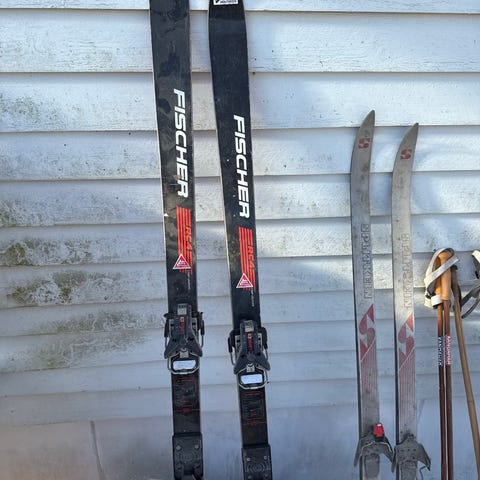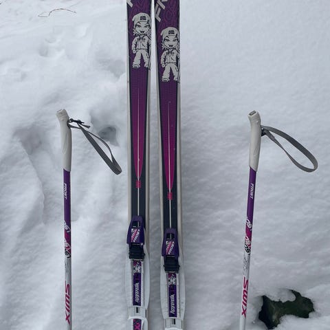 Disse langrennski er veldig godt brukt og passer for barn 9-10. De har klistremerker på fra før på skiene. Det blir solgt sammen med ski stengene.
