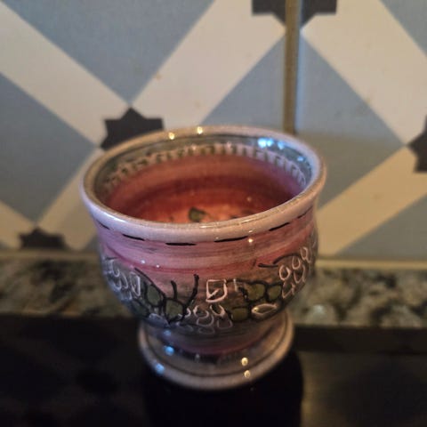 Keramiske blomsterpotter i oransje farge med lys dekor langs kanten og på sidene. Settet består av 2 like potter. Pottene har sylinderform med lett innsvinget kant øverst. Egner seg til innendørs bruk til mindre planter eller urter. Materiale er glasert keramikk.