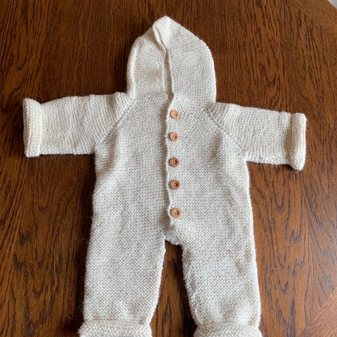 Hjemmestrikket selma sovedrakt. Strikket i merinoull og alpakka følgetråd. Tykk, myk og varm! Ble for liten før vinteren kom, så den ble kun prøvd på. Strikket av meg.