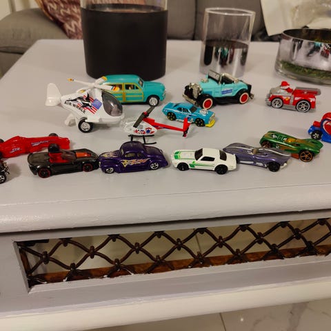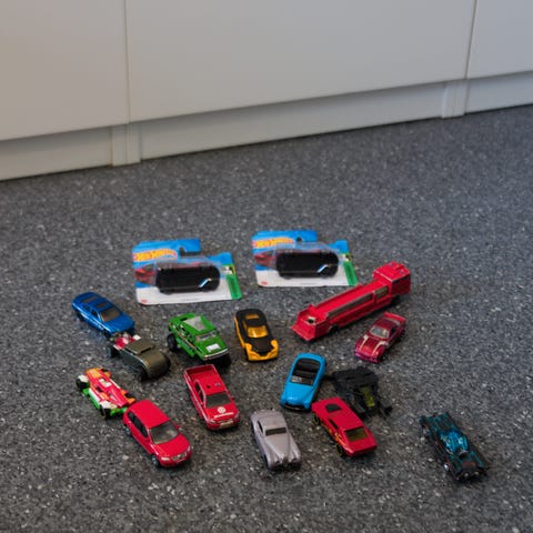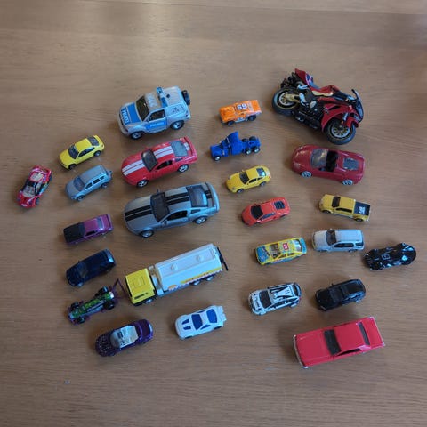 Selger en kasse med biler,buss,gravemaskin,traktor.osv