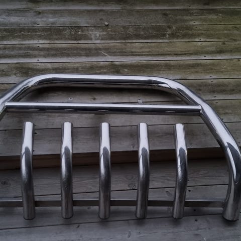 Rustfritt stål kufanger med mål på ca. 90 cm bredde og 50cm høyde. Laget for å beskytte fronten på kjøretøyet.