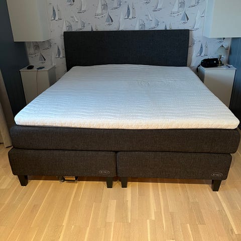 Selger en flott og solid hodegavl i mørkegrått stoff, med 2 justerbare ryggstøtter. Gir et skikkelig “hotellfølelse”-preg på soverommet. Den er veldig komfortabel å lene seg mot når du vil lese, se TV eller bare slappe av i senga, spesielt når man slår ned ryggstøttene i sittestillig.