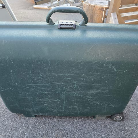 Samsonite Advantage SSL koffert laget av hard plast Kofferten har hjul for enkel transport og innvendige stropper for sikring av innholdet. Frå 1970/80-talet.