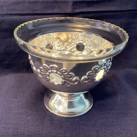 Skål på stett, eller sjampanjekjøler, fruktfat i metall, med fint mønster.