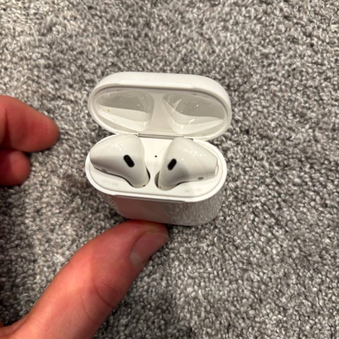 Apple hodetelefoner i etuiet. Produktet er bærbart og designet for trådløs lydavspilling.