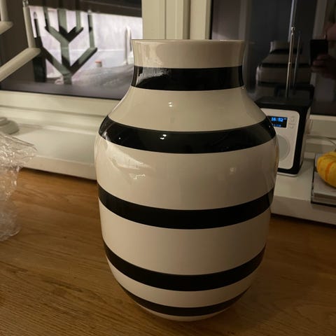 Kähler vase med grå og hvite horisontale striper. Laget i keramikk, rund form med åpen topp. Passer til dekorasjon eller som blomsterholder.. må hentes..ved hurtig handel kan pris gås ne?