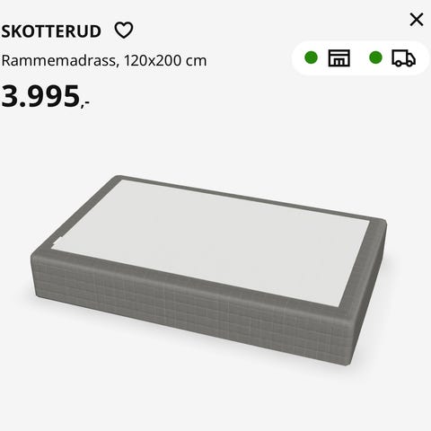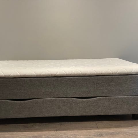 Sengen har et stilrent design i nøytral gråfarge, som passer inn i de fleste soverom. Den består av to solide madrasser med overmadrass på toppen, og står på stabile metallben.