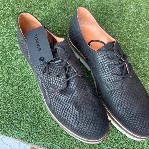 Bianco pensko i størrelse 42. Skoene er svarte og har lisser. Skinnsko. Passer til formelle anledninger eller som pent fottøy.