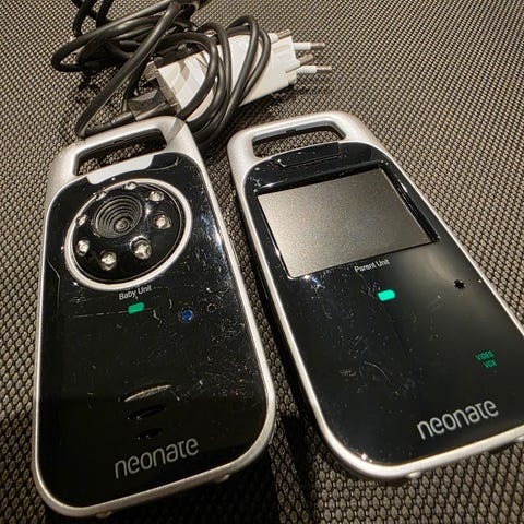 Neonate Babycall med to enheter og ladestasjoner. Enhetene har skjermer og er designet for lydovervåkning av barn.