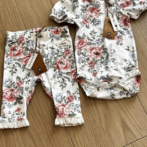 Ett sett i str 62, 1 body i liten str 74, resten i str 68. Alt brukt samtidig da 62 settet er litt stort og 74 bodyen er litt liten.