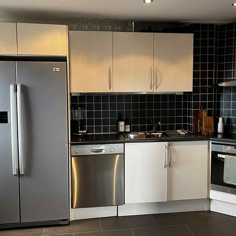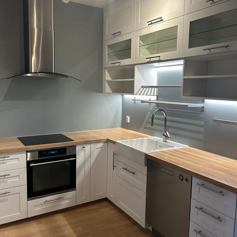 Kjøkken med hvite skap og benkeplate i tre selges for en billig penge. Må hentes.