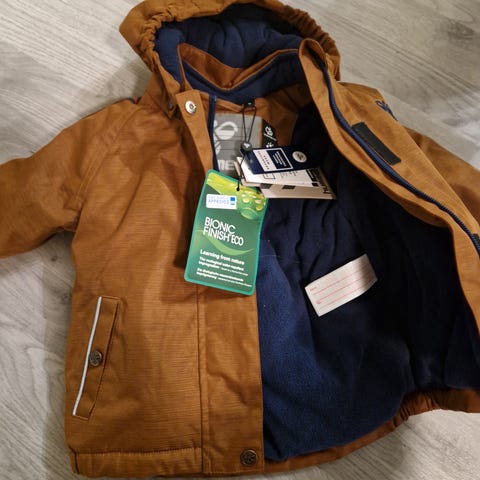 Vinterjakke fra Hummel med fleecefor på innsiden. Har refleksmerke på baksiden og striper ved sidelommene. Avtagbar hette med falsk pels.
