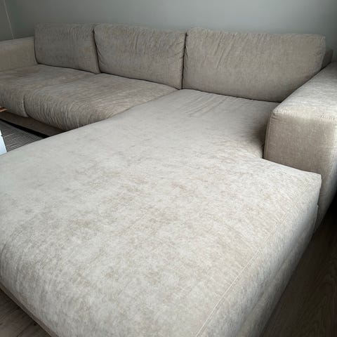 Sofaen er litt over ett år gammel, og har ingen slitasje. Trekkene kan tas av og vaskes. Følger med både sorte og sølv bein. Selges da vi ønsker en mindre sofa. Må hentes i Oslo.