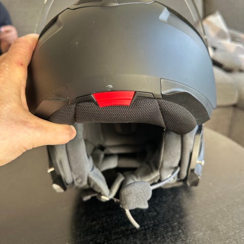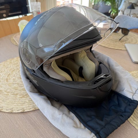 Schuberth åpningshjelm. Har vært veldig forsiktig brukt og jeg har vært veldig nøye på at den ikke skal ha blitt mistet i bakken. Miste du en hjelm i bakken så reduseres beskyttelsen og jeg har aldri mistet den i ned. Hbo 2000kr