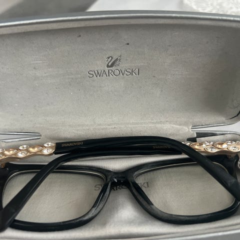 Lyseblå stenger med lyseblå stener. Progressiv brille.Styrke: Høyre Sf +3,00, prisme 1,00. Venstre Sf +2.75, prisme 1,00. Nær begge 2,25.Innfatning: SWAROVSKI SK 5472 016