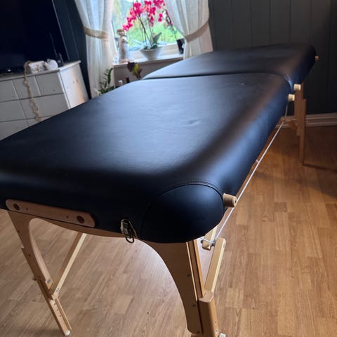 Massasjebenk med svart polstring og aluminiumsramme. Benken er sammenleggbar og bærbar med håndtak for enkel transport. Den har et ansiktsutskjæringshull for komfort under bruk. Passer til massasje og behandling i ulike miljøer. Denne har justerbar høyde.
