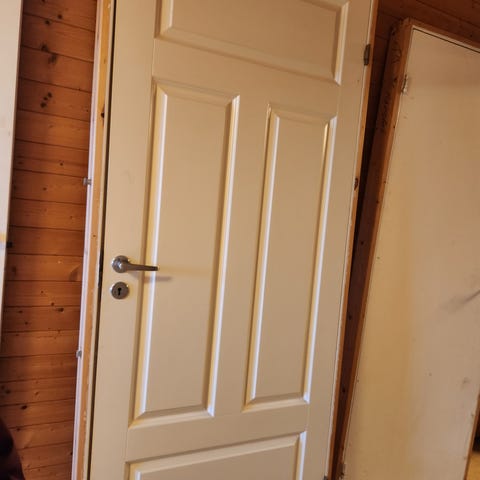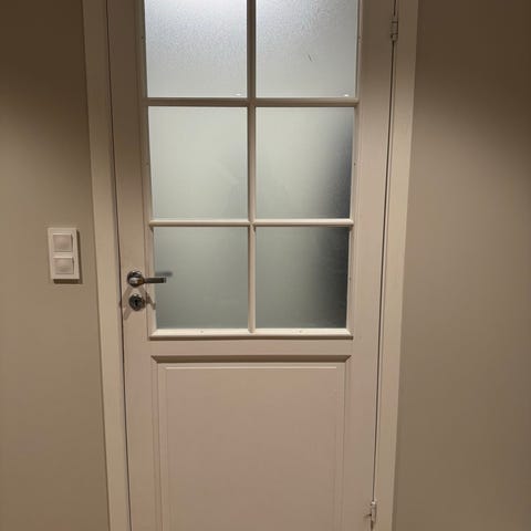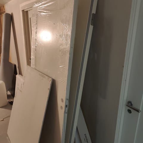 Brukte Hoveddør i hvit farge med et smalt, vertikalt vindu. 199cm/99cm. Feil kjøpt ( på Finn)