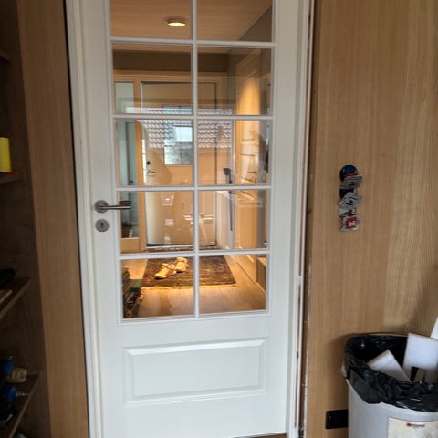 Hoveddør med smalt vindu i hvit