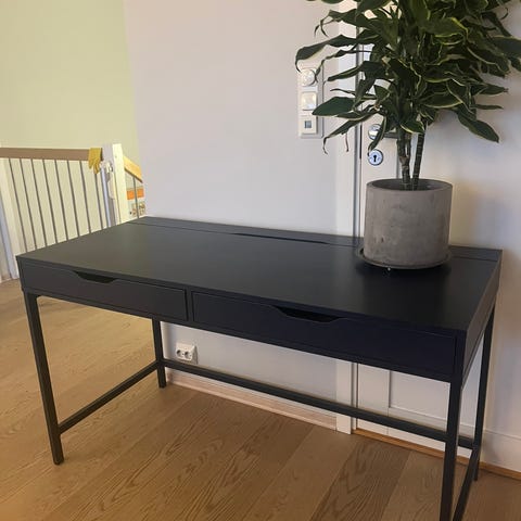 Kjempefint skrivebord med to skuffer og åpning bakerst på bordplaten til å skjule ledninger eller andre ting. Nydelig farge i en blå/grønn grå/turkis farge som dessverre er utgått fra IKEA.