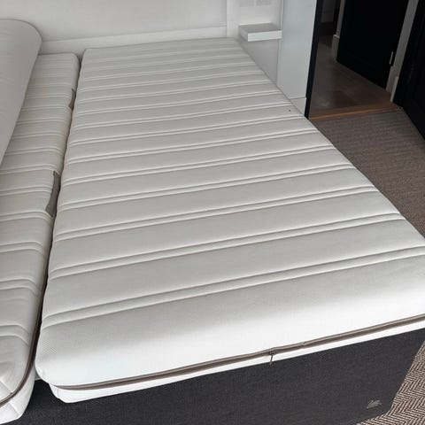 Jensen G2 kontinentalseng med hvitt overmadrassstoff og mørk ramme. Sengen har en enkel og funksjonell design med tre ben i lys tre. Passer til ulike soveromsmiljøer. Har hatt sengen siden 2021.