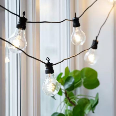 LED lyslenke til balkong og lignende. Den er 5 meter lang og lysene henger i "tråder" fra ledningen (se bilde). Lysfargen er varm hvit.