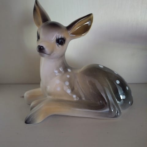 Hel og fin rådyr/hjort i porselen. 10 cm lang og 9,5 cm høy. Ingen merking. Kan sendes mot at kjøper betaler porto på 69.-
