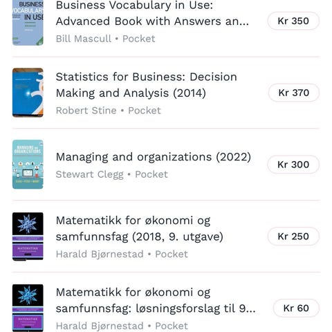Pensumbøker til bachelor i økonomi og administrasjon selges, alle bøkene har annonser individuelt, se annonser for pris,