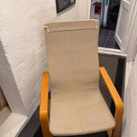 Hvit ikea stol 4-5 år gammel, litt flekker trekk kan taes av og vaskes. Må hentes selv