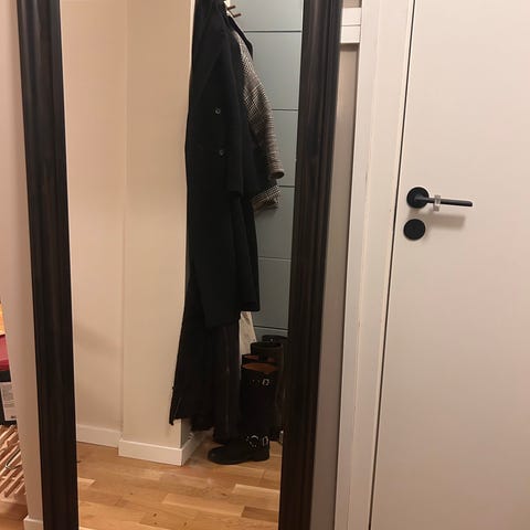 IKEA speil med svart ramme, rektangulært design.