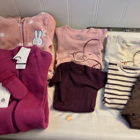 Alt er pent brukt, noe har mer slitasje enn det andre, av ull klærne er det den lilla bodyen fra refleks som har tydeligst slitasje, det andre fremstår pent brukt / ubrukt.