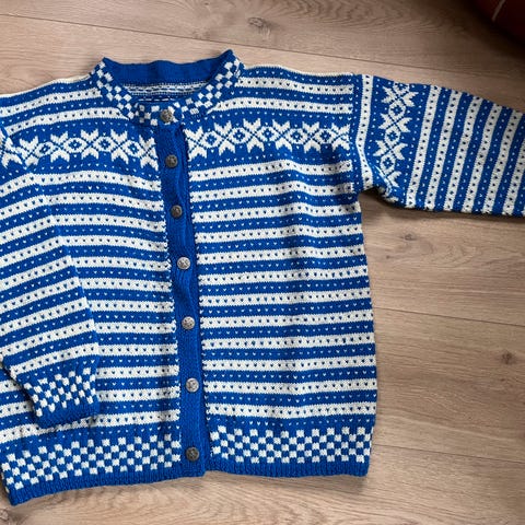God og varm hjemmestrikket cardigan / kofte. Antatt størrelse ca. XL (ingen merkelapp). Jeg har derfor tatt mål så du kan sjekke med deg selv (se bilder). Føles som ull, men jeg er ikke sikker. Flott tradisjonelt mønster. Se bilder for mål.