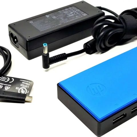Original HP-lader følger med. Docken lader PC og MacBooker opp til 65watt.