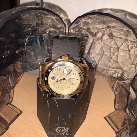 Selger en Philipp Plein-klokke i størrelse 41 mm. Klokken er for stor for meg og har derfor ikke vært brukt. Den selges komplett med original eske og garanti.